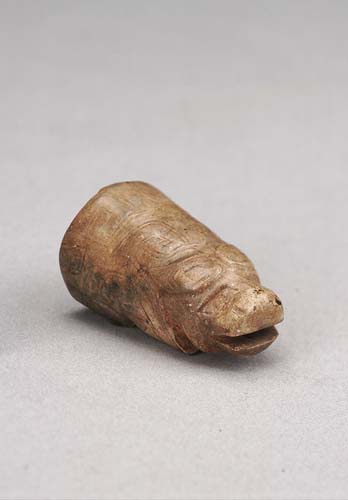 黃褐色,底部受沁較深。全形似圓錐體,牛頭端小、尾端大,未雕出軀體全貌。牛作蜷伏狀,口張,首微昂。通體滿飾勾連紋,口鼻目角均全。口下有一小穿,腹下四足,中為一槽,槽內殘留硃紅。尾部下垂,僅略顯痕跡。婦好墓出土一件玉牛(M5:410),姿態與此器類似,但整體形制有所不同。