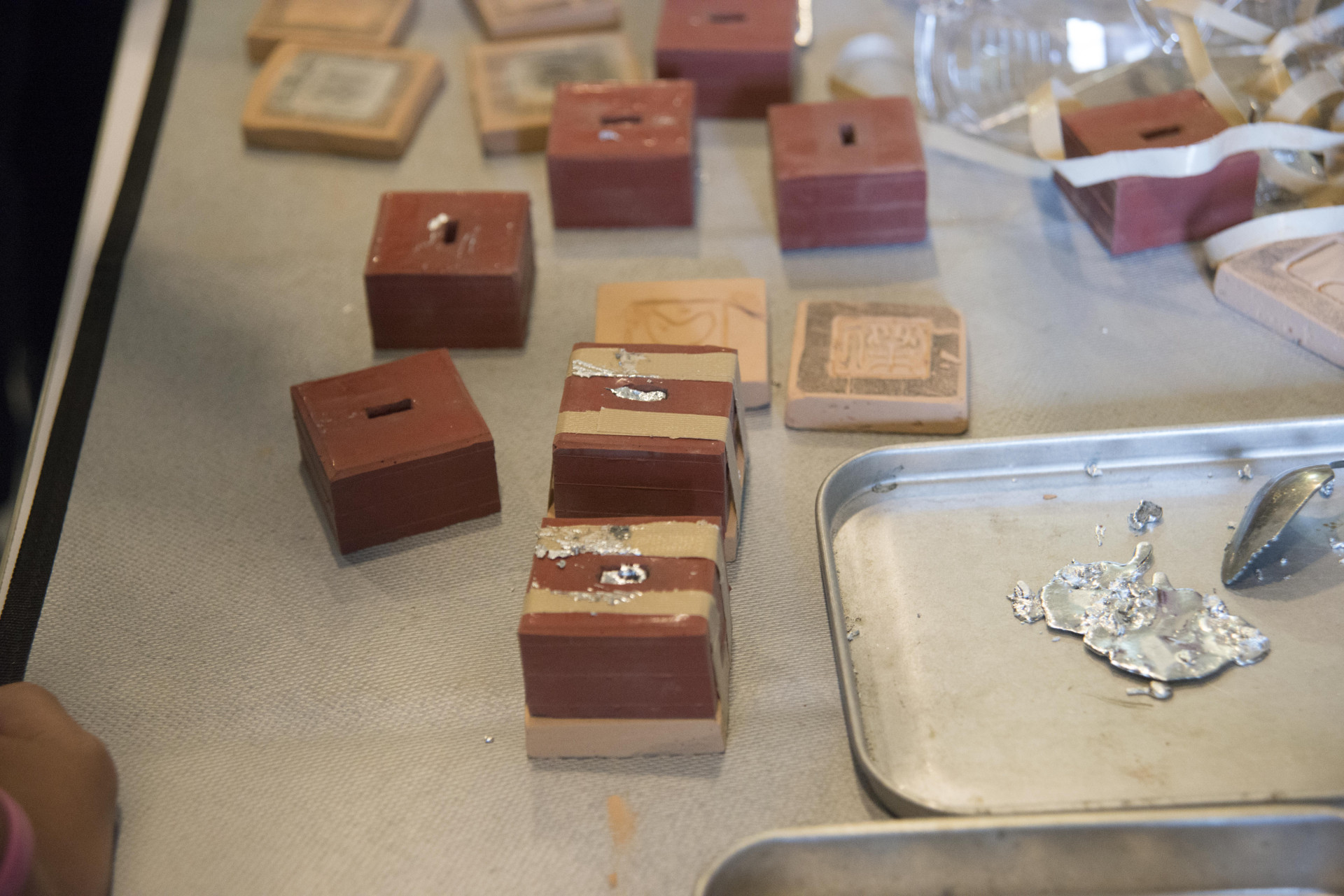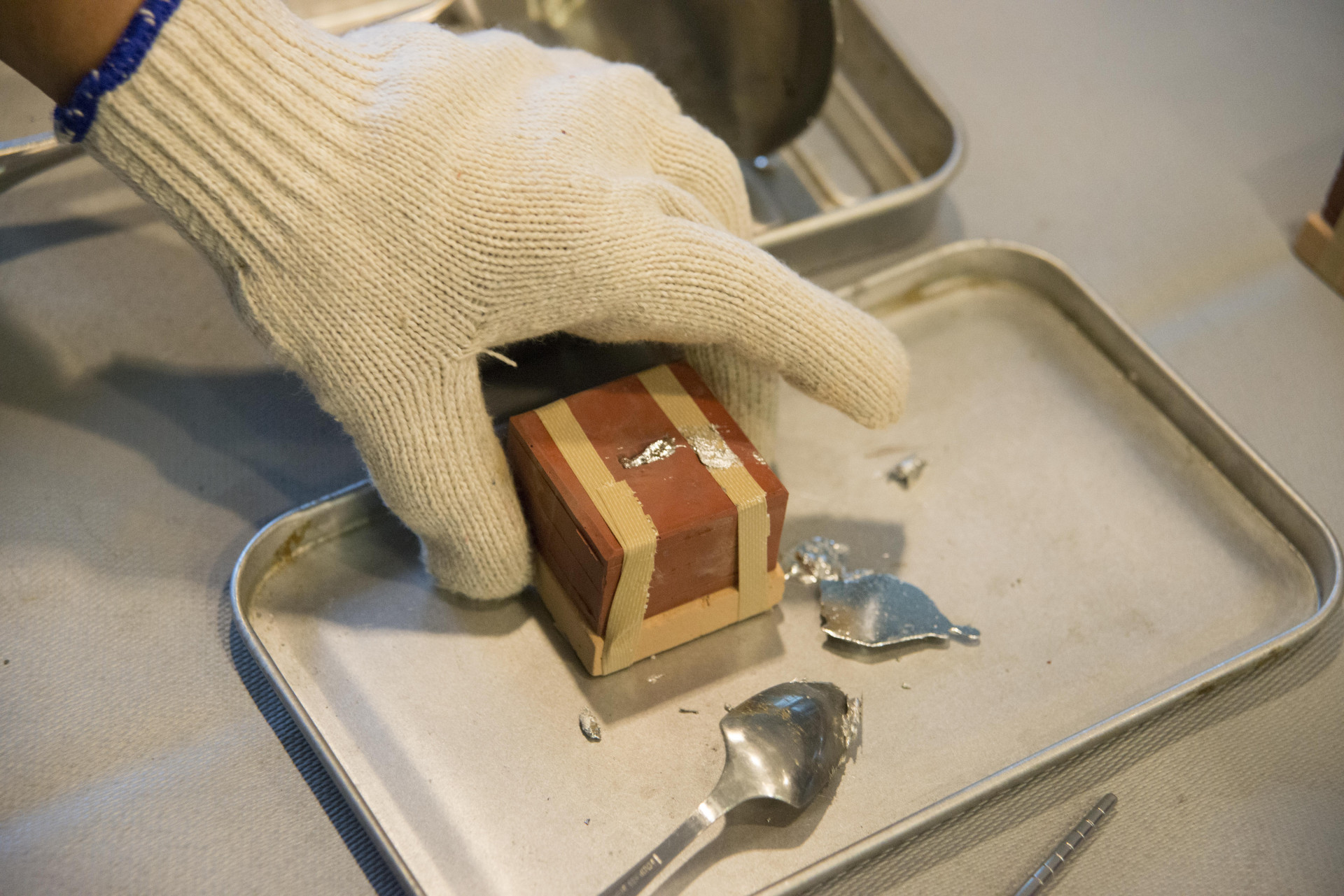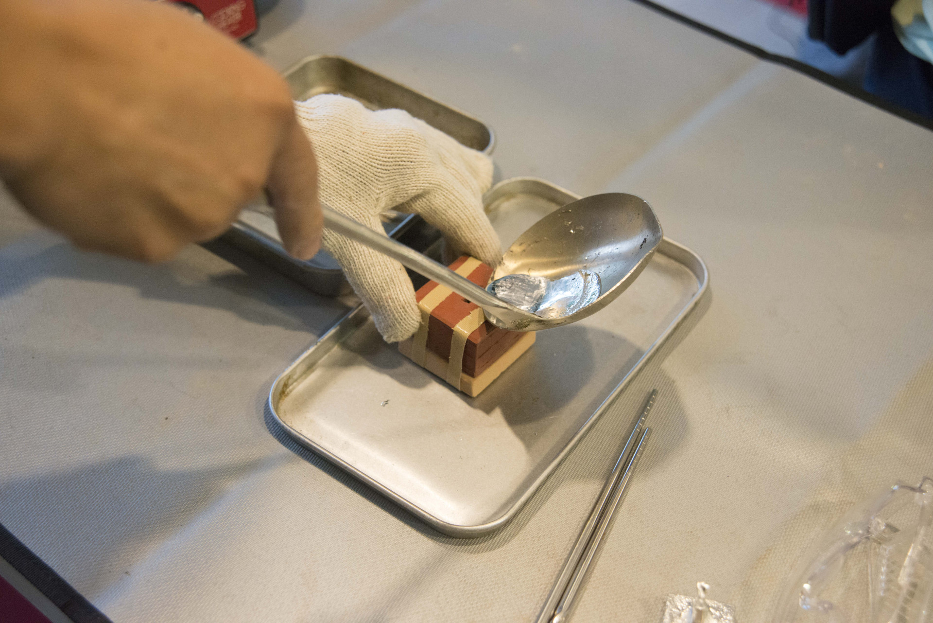 | 20分 | 澆注錫液(專人協助) -將刻畫完成的陶版及模具黏合 -由專人協助澆注錫液至模中 | |