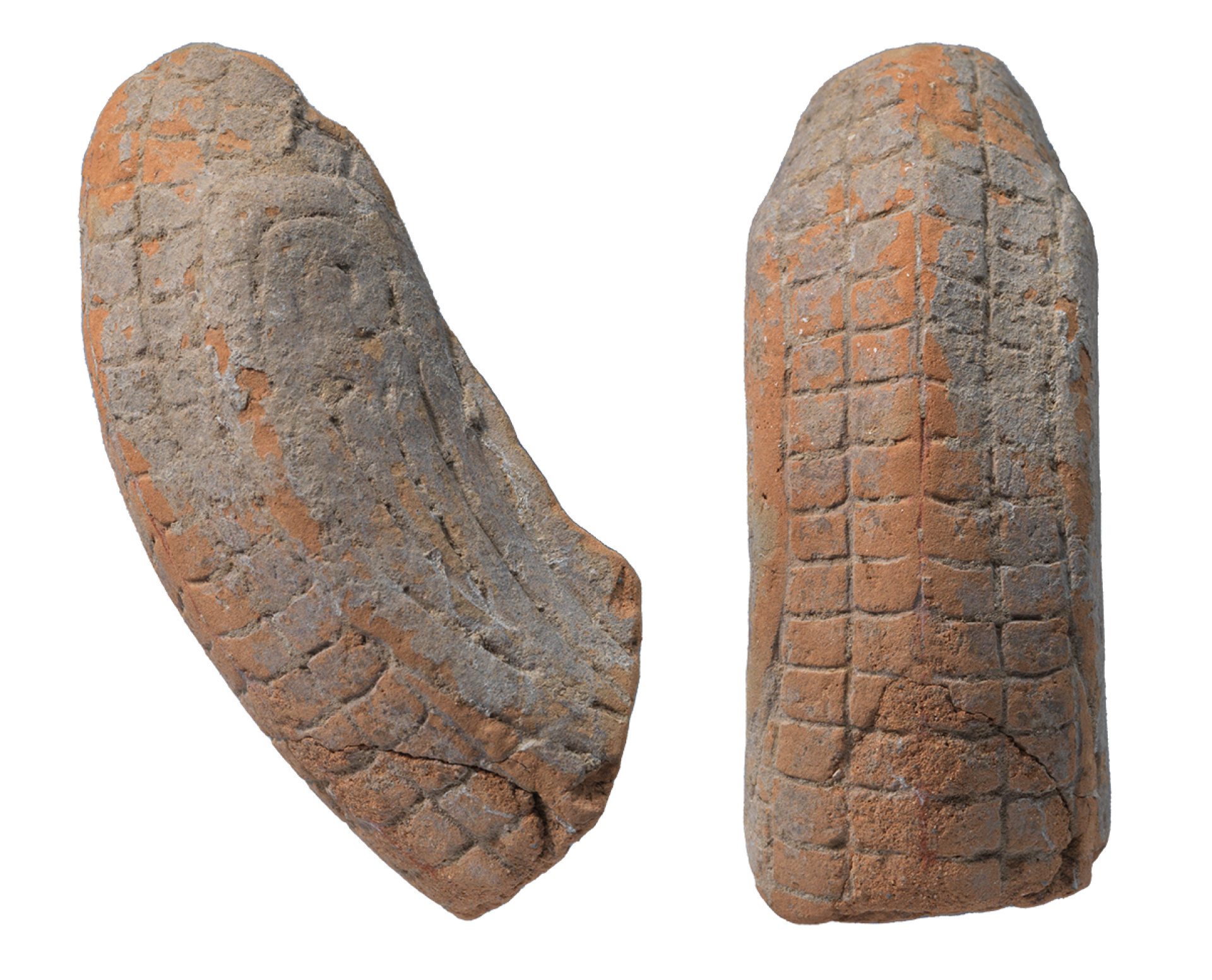 R016666是浮雕蜷曲龍紋(夔龍紋)的母模,表面塗有白土,其上以朱筆描畫龍鱗紋的底紋。R16667有立體C字型角,推測是大型饕餮紋的角。浮雕紋飾上殘留粗略的刻線痕。目前尚未發現有如此大型饕餮紋的青銅器。R053109是把手母模,正面有簡單的鱗狀羽毛紋,兩側分別雕刻飛羽紋。R017003浮雕鳥爪的母模,推測為尊等大型器類的紋飾母模。R016671橢圓形突起,雕刻背對背的獸面紋。可能是卣或觶等橢圓形器物的蓋鈕母模。