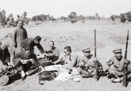 一九二八年殷墟第一次發掘,工作人員及軍隊共進午餐(彎身者為董作賓)